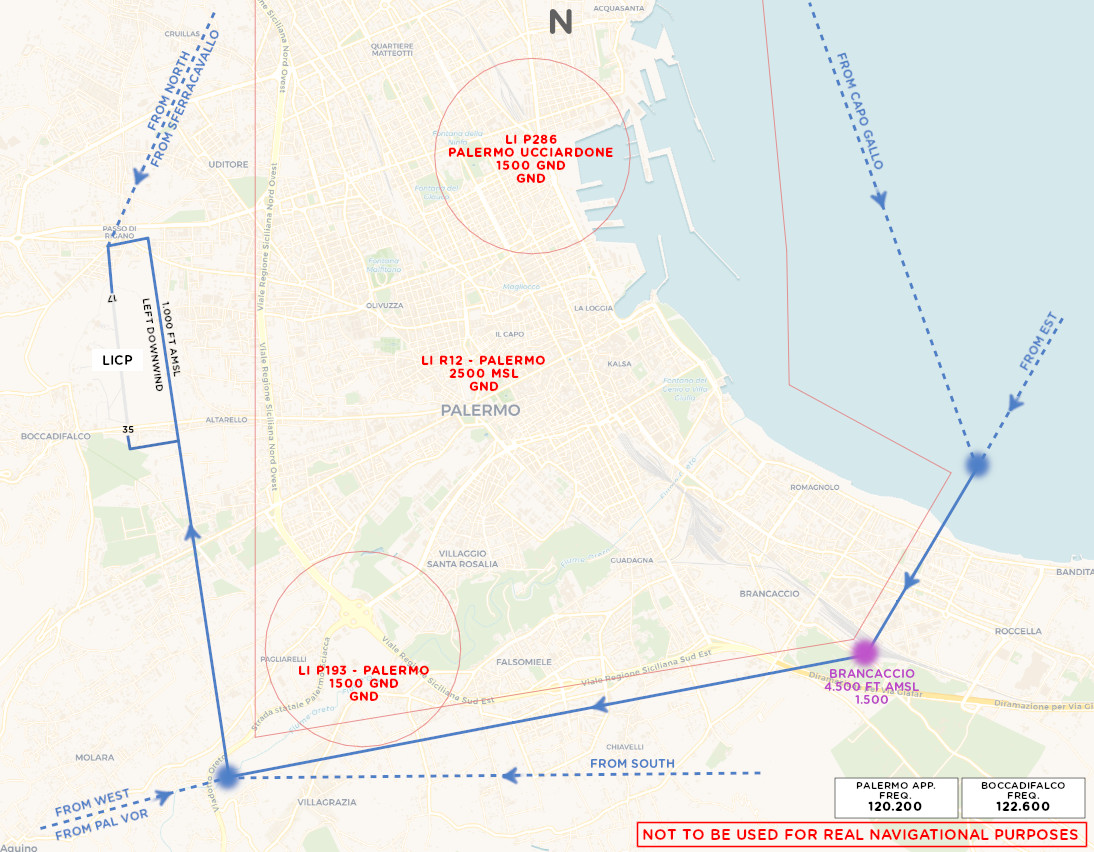 1) I traffici provenienti da NORD possono avvicinarsi al campo da Sferracavallo riportando il lungo finale quando in vista dei traffici essenziali; In presenza di 2 traffici già in circuito procedere lungo costa in direzione del porto di Palermo per poi avvicinarsi al campo da Sud via Brancaccio (ad est della città ai piedi del Monte Grifone) ed entrare in sottovento sinistro.